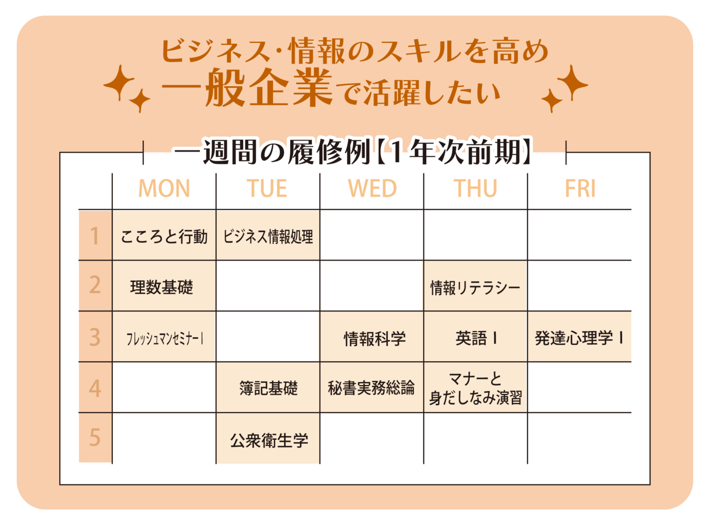 ビジネス現場で職業人として業務を遂行する上で何が求められているのか、ビジネス実務の意義や内容など現場の基礎知識を学びます。