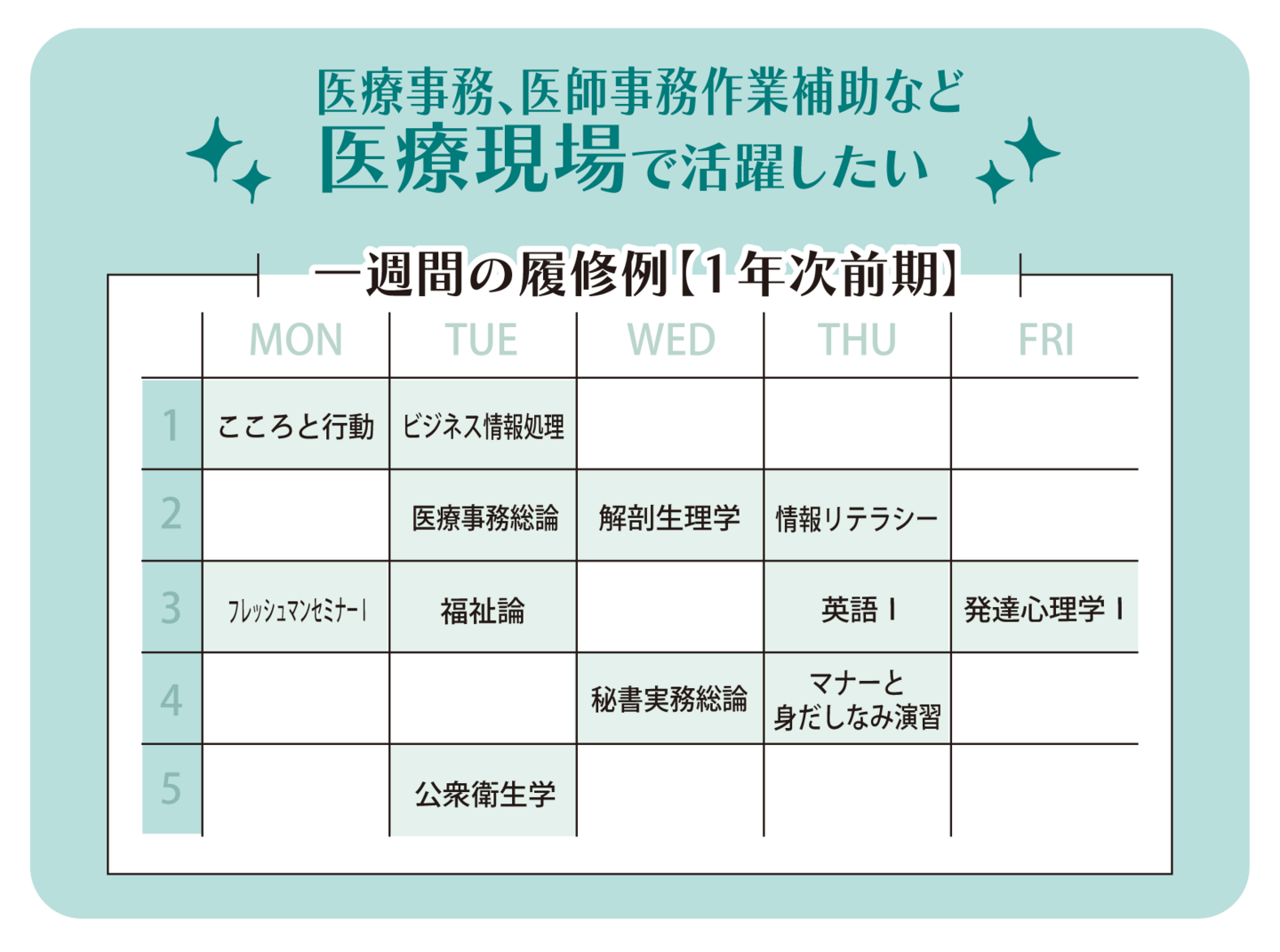 医療事務に必要な知識(医療機関の概要、医療保障制度のしくみなど)について学びます。