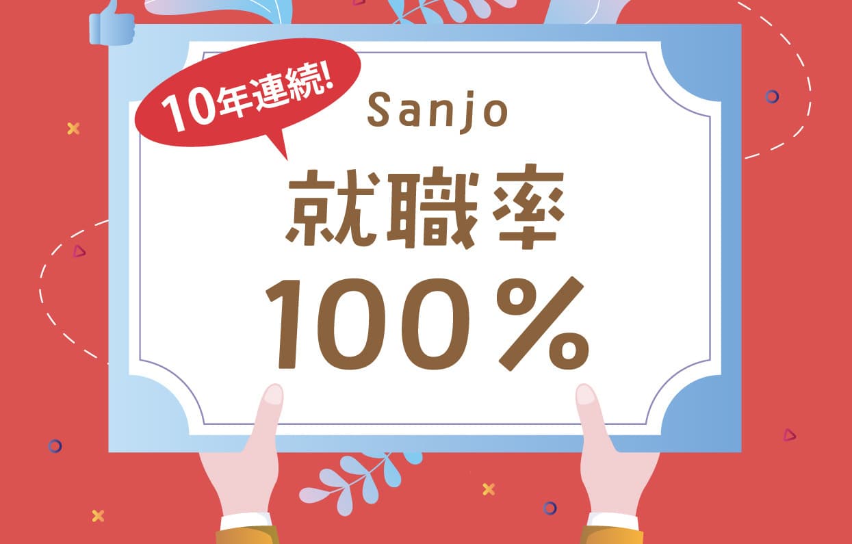 人間生活学科って? 将来に活かせるスキルを身につけよう! 詳しくはこちら どんなことを学ぶ? 2年間の学びを見てみよう♪詳しくはこちら どんな一週間? 1年次はどんな時間割?見てみよう♪詳しくはこちら どんな資格を取得できる? Sanjoでは多くの資格を取得できます。詳しくはこちら 卒業後の就職先は? Sanjoの就職率は100%!詳しくはこちら 入試情報 2027年度入試情報はこちら詳しくはこちら