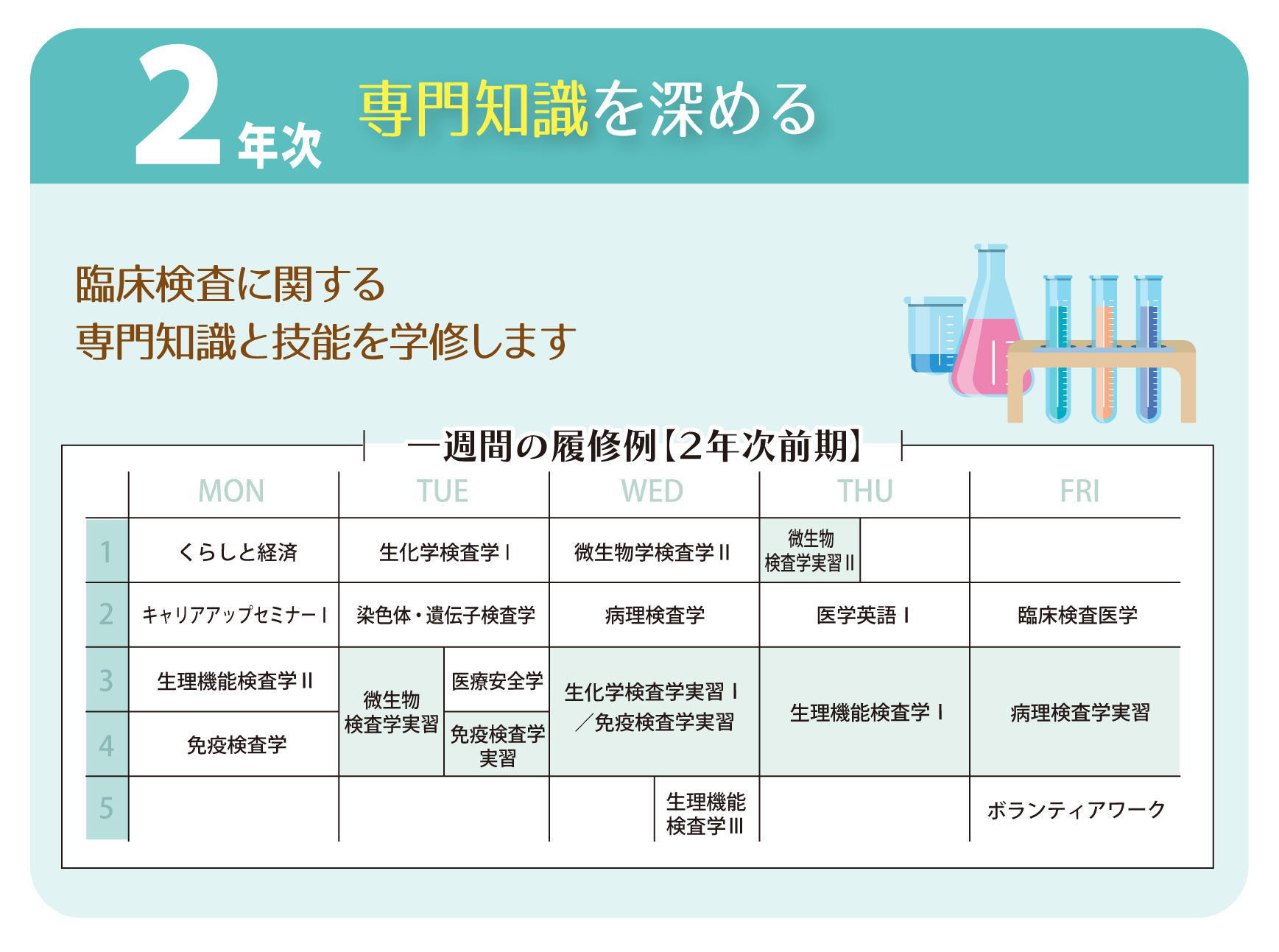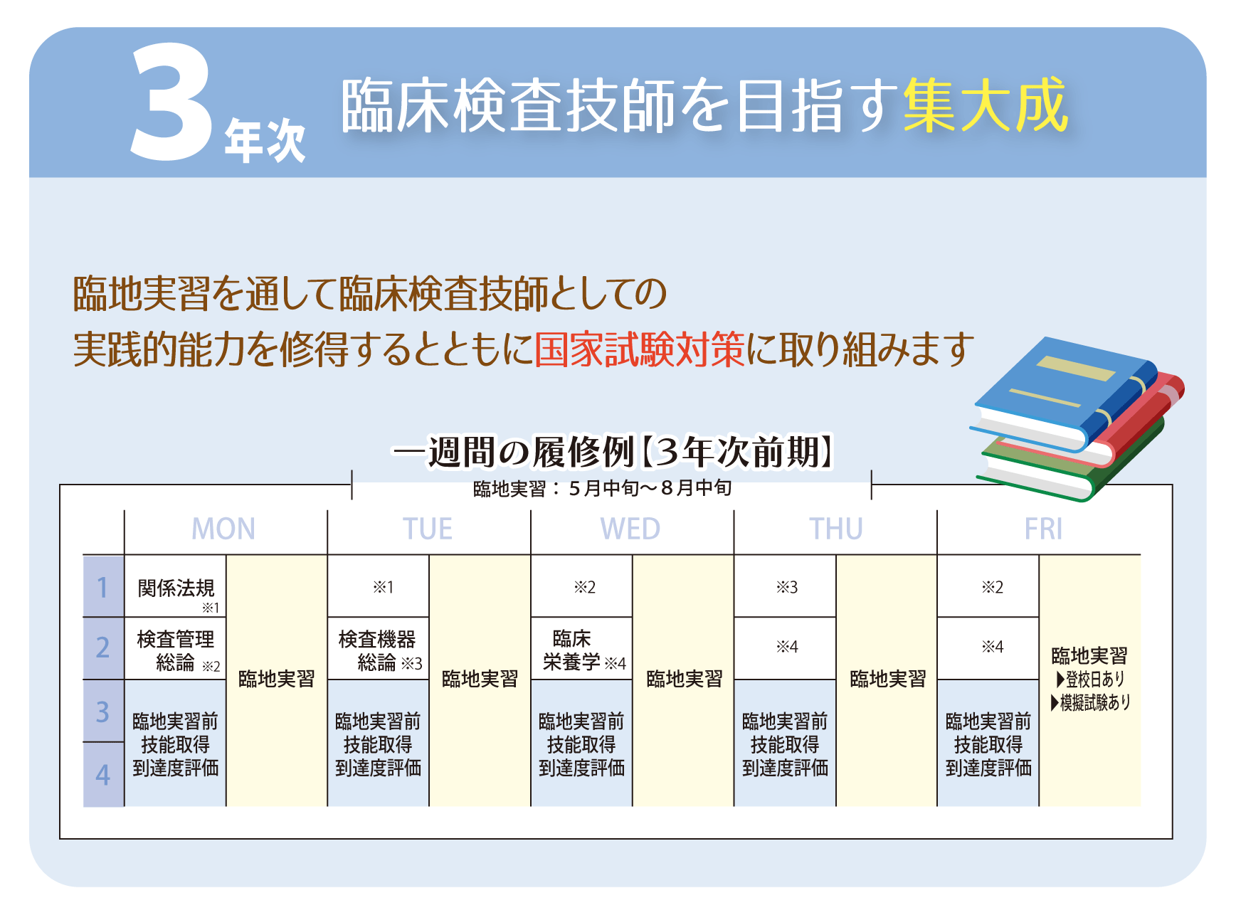 医療現場を体験し、1・2年次での学びをより実践的なものにします。さらに、患者やスタッフへの対応など医療人としての心構えを身に付けます。